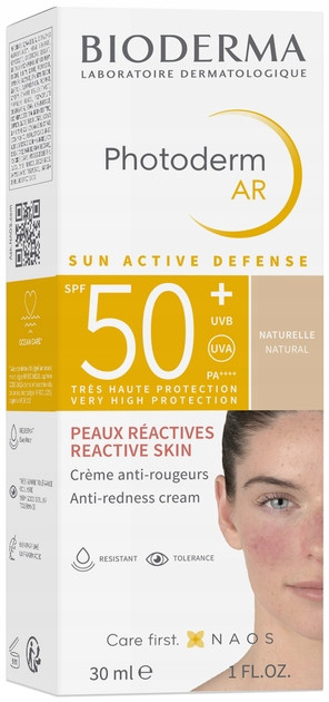 Bioderma Photoderm AR SPF50+ to krem tonujący stworzony specjalnie dla skóry wrażliwej i naczynkowej, skłonnej do zaczerwienień i trądziku różowatego. Dzięki innowacyjnym technologiom SUN ACTIVE DEFENSE i patentowi Rosactiv™ produkt zapewnia bardzo wysoką ochronę przeciwsłoneczną oraz redukuje zaczerwienienia, wzmacniając naczynia krwionośne i łagodząc podrażnienia. Naturalny odcień kremu wyrównuje koloryt skóry, maskując rumień i niedoskonałości.