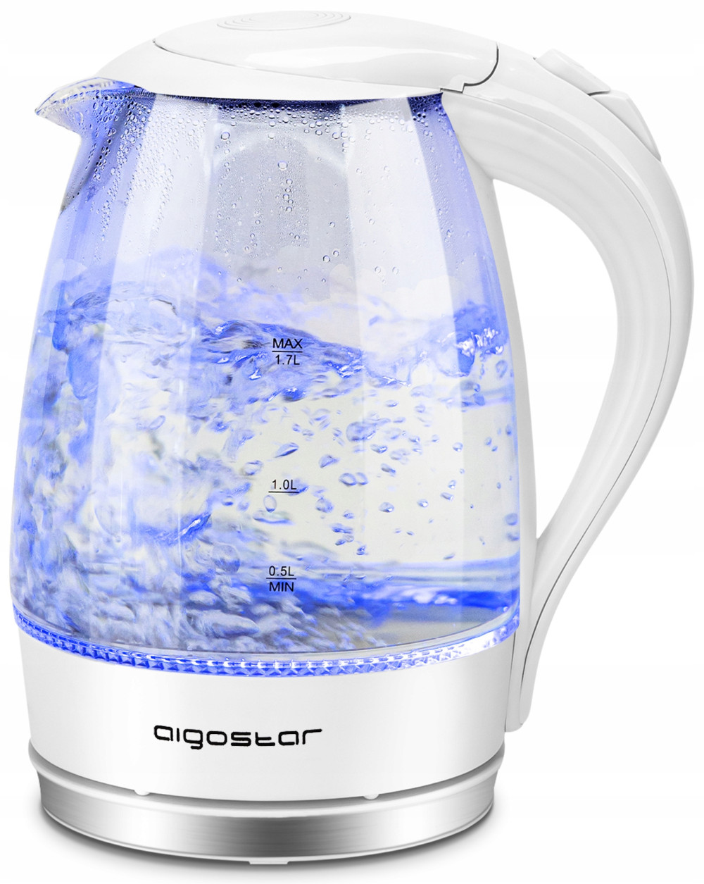 Dzięki mocy 2200 W czajnik Aigostar może zagotować 1,7 l wody w 5 minut.