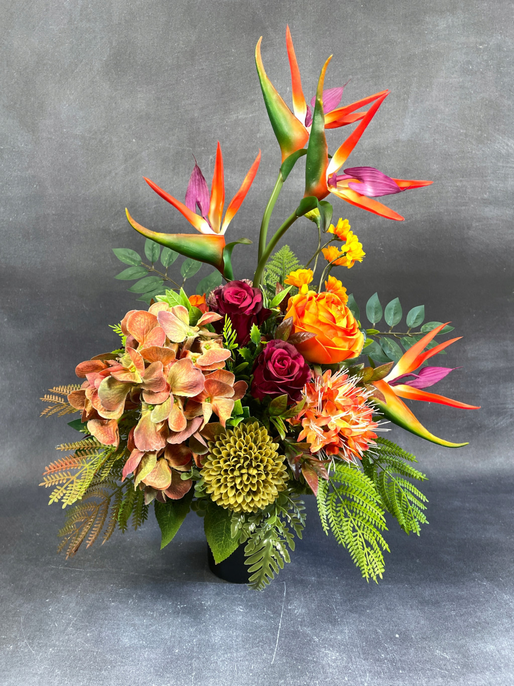 Bukiet został wykonany z materiałów odpornych na działanie czynników zewnętrznych – w tym wilgoci, promieniowania UV, wiatru czy zmiennych temperatur. Dzięki temu kompozycja zachowuje swój elegancki wygląd przez długi czas, niezależnie od pory roku.
