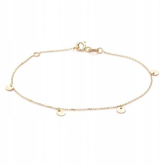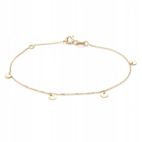 Delikatna bransoletka wykonana ze złota próby 375. Posiada regulowane zapięcie. Długość minimalna bransoletki 15,5 cm, długość maksymalna 17,5 cm. Na łańcuszku złote blaszki o średnicy 4 mm.