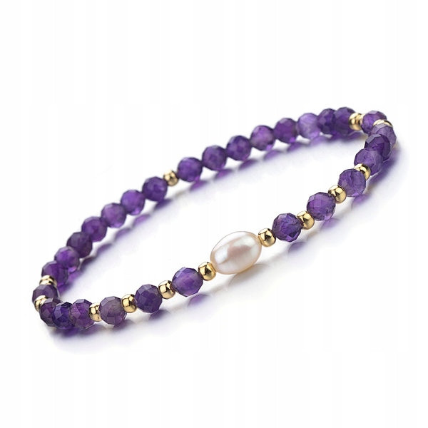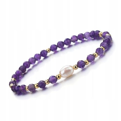 Bransoletka jest wykonana z naturalnych Ametystów oszlifowanych fasetkowo oraz Perełki Rzecznej. Całość jest nawleczona na gumkę sylikonową. Obwód bransoletki wynosi 18 cm. Kamienie jak i perełka są pochodzenia naturalnego co sprawia iż każda bransoletka jest niepowtarzalna i może nieznacznie różnić się kolorem lub odcieniem od tej przedstawionej na zdjęciu.
