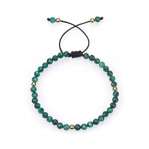 Przedmiotem sprzedażny jest stylowa, starannie wykonana, pasująca do każdej stylizacji bransoletka z naturalnego Malachitu w kształcie kulek oszlifowanych fasetkowo. Obwód bransoletki można regulować, od 18 cm do 23cm. Kamienie są pochodzenia naturalnego co sprawia iż każda bransoletka jest niepowtarzalna i może nieznacznie różnić się kolorem lub odcieniem od tej przedstawionej na zdjęciu.