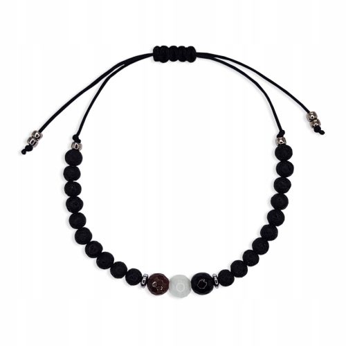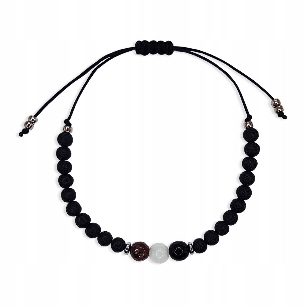 Ta wyjątkowa biżuteria wykonana jest z czarnej nylonowej nici o grubości 0,8 mm. Po środku umieściliśmy trzy piękne naturalne kamienie - GRANAT, KAMIEŃ KSIĘŻYCOWY, ONYKS (6mm). Całość dopełniona czarną lawą wulkaniczną. Dodatkowo zastosowano przekładki z hematytu w kolorze srebrnym oraz koraliki toho.