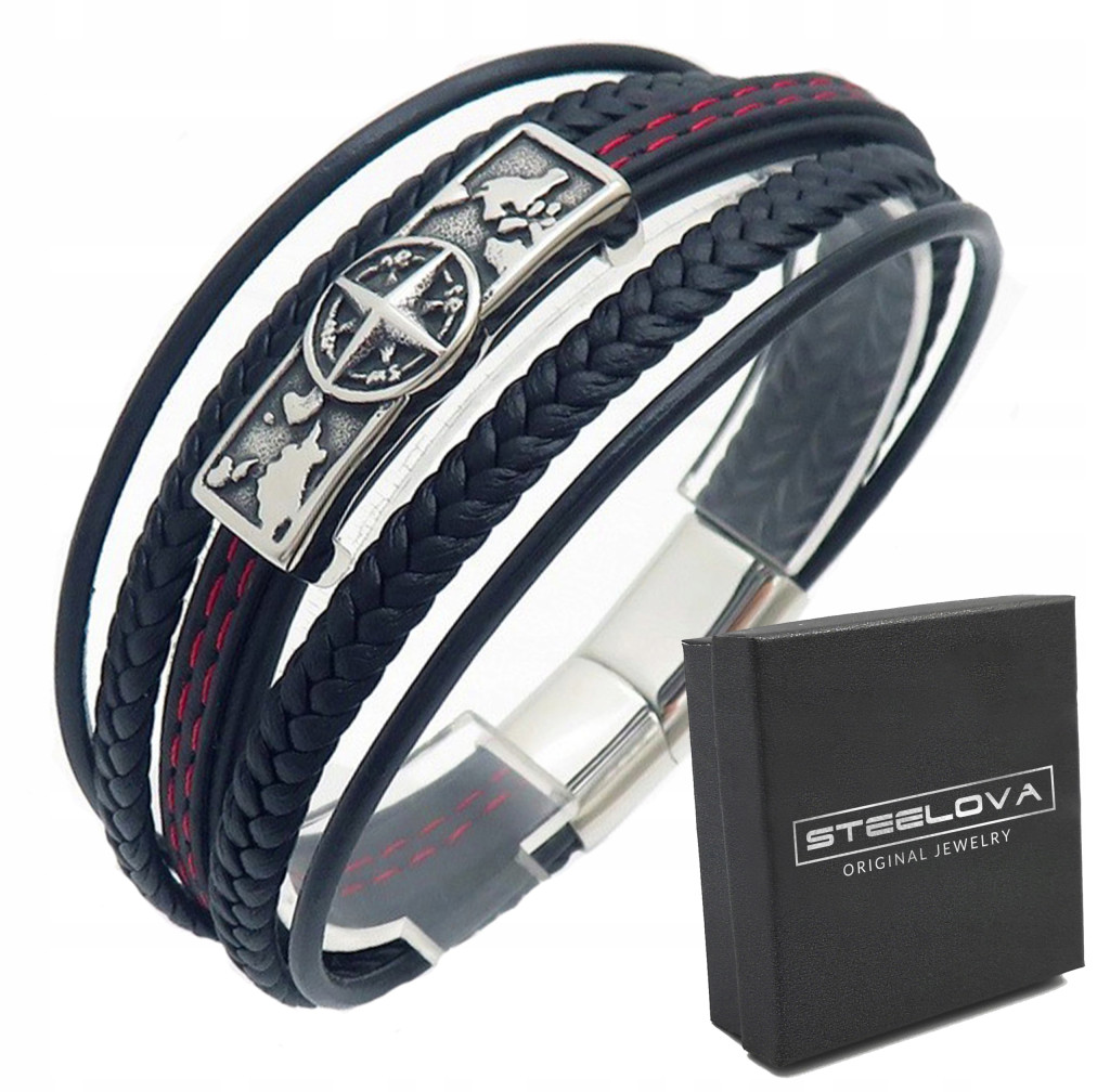 ✅ Produkt składający się z przeplatanych rzemyków skórzanych oraz gładkich pasków z dodatkiem czerwonej nitki, które idealnie komponują się ze stalowymi, wypolerowanymi detalami w postaci motywu z kompasem.