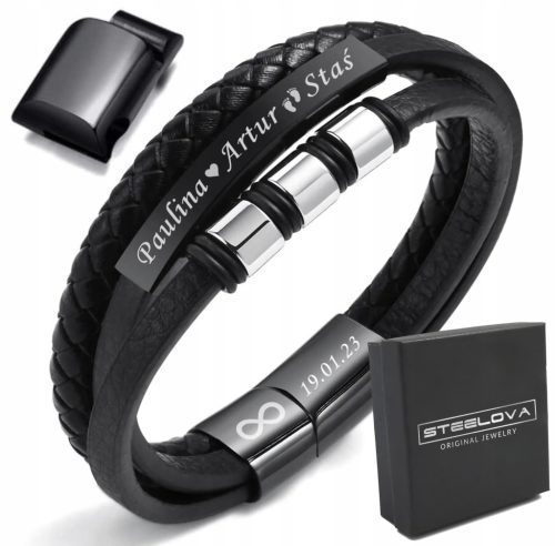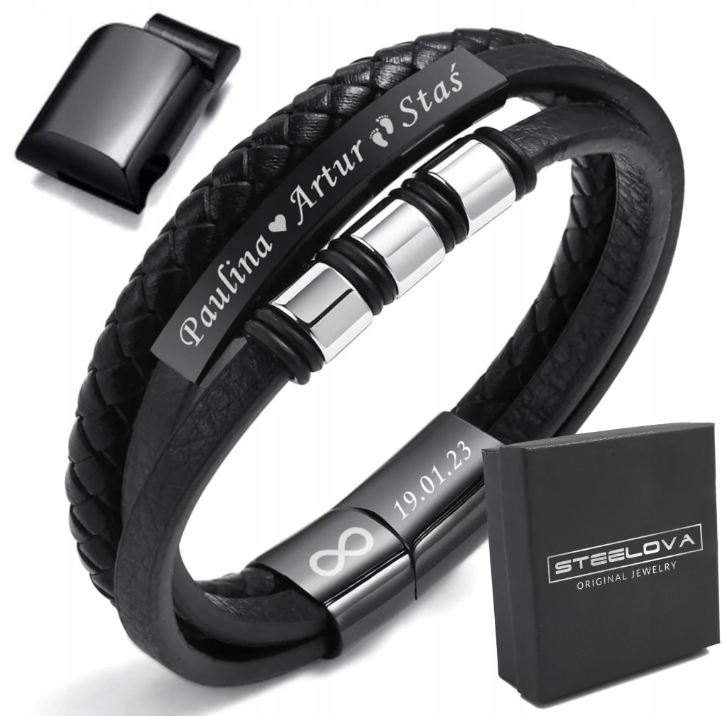 ➡️Elegancka skórzana bransoletkę z blaszką i koralikami, która doskonale podkreśli Twój styl. Wykonana z wysokiej jakości, czarnej skóry naturalnej, charakteryzuje się unikalnym designem z przeplatanymi rzemykami i gładkimi paskami, wzbogaconymi stalowymi elementami.