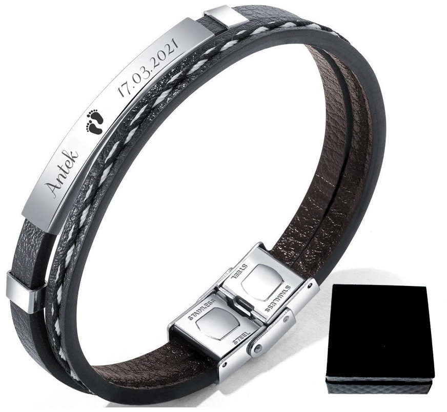 Polecamy designerską bransoletkę wykonaną z najwyższej jakości stali szlachetnej 316L. Charakteru i odważniejszego stylu, dodają jej białe przeszycia. Bransoletka idealna na motyw grawerunku ''imiona dzieci'', '' imiona zakochanych'', ''ważne daty'' lub każdy inny. Podkreśli swój styl i charakter bransoletką z klasą.