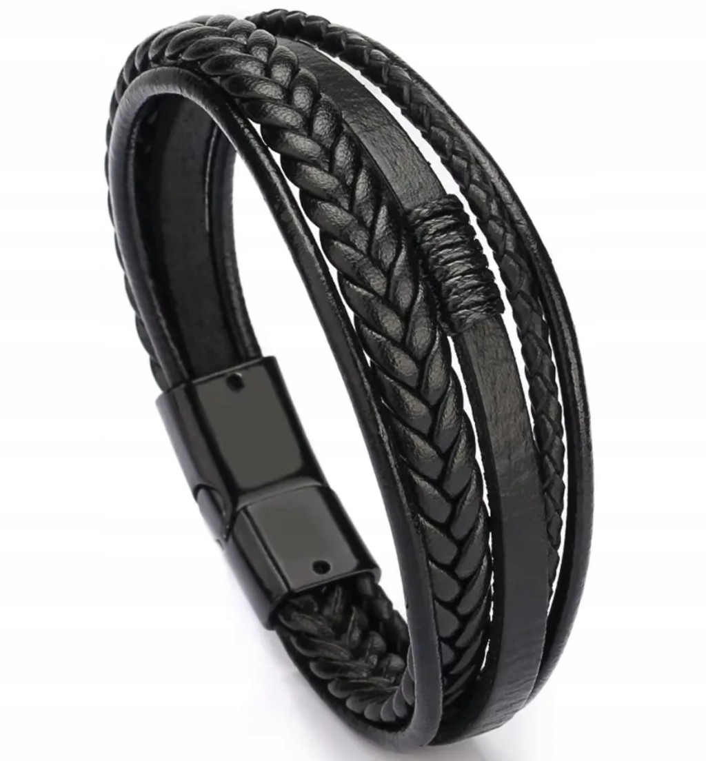 Bransoletka Skórzana Czarna Pleciona Mocne Zapięcie Magnes Stal Szlachetna