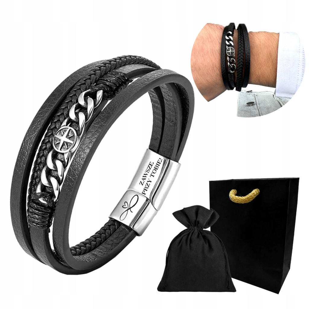 Prezentujemy Państwu elegancką męską bransoletkę skórzaną w kolorze czarnym z motywem Róży Wiatrów. Wykonana z wysokiej jakości stali chirurgicznej 316L i naturalnej skóry.