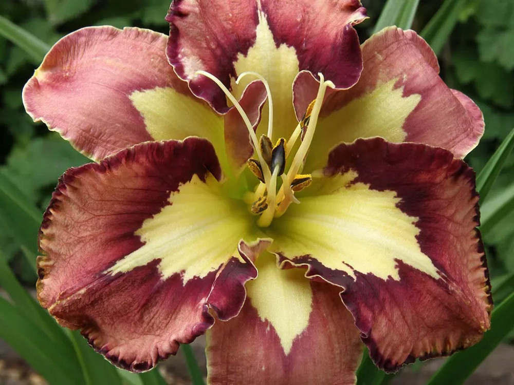 Kwiaty Liliowca Spacecoast Behavior PaternCharakteryzują się intensywnie żółtym środkiem oraz ciemno bordowymi płatkami.