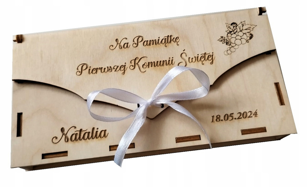 materiał: sklejka brzozowa 3mm, wycinana i grawerowana laserowo, satynowa wstążeczka