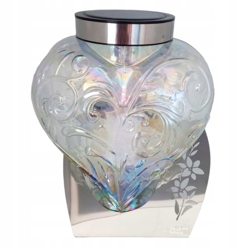 Nowoczesny lampion solarny w kształcie serca ze srebrną podstawką, ślicznym ażurowym kwiatem oraz tęczowym szkłem, świetnie sprawdzi się jako dekoracja grobu naszych najbliższych.