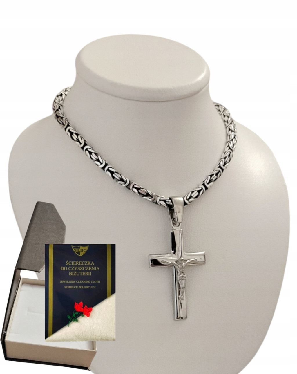 Łańcuszek splot królewski wraz z krzyżykiem wykonane są ze srebra próby 925. Zgodnie z Polskim Prawem każdy wyrób w którym waga przekracza 5 gramów przebadany i ocechowany jest przez Państwowy Urząd Probierczy . Zakupioną biżuterię wyślemy ładnie zapakowaną z metką jubilerską. Produkt ,który otrzymasz będzie w 100% zgodny z opisem .
