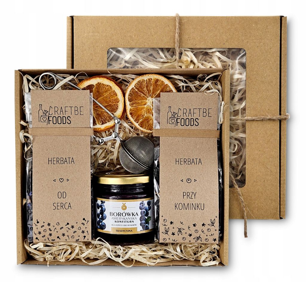 Herbata Craftbe Przy Kominku, Herbata Craftbe Od Serca, konfitura Borówka Amerykańska Tradycyjna, Zaparzacz do herbaty, Suszone plastry pomarańczy 2szt, piękne opakowanie z naturalnym wypełnieniem udekorowane jutowym sznurkiem z zawiązaną kokardką.