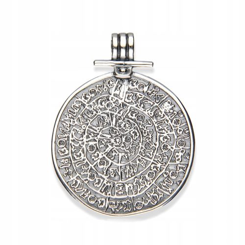Wisiorek wykonany z oksydowanego, postarzonego srebra przedstawiający aztecką historię ziemi - pismo obrazkowe.