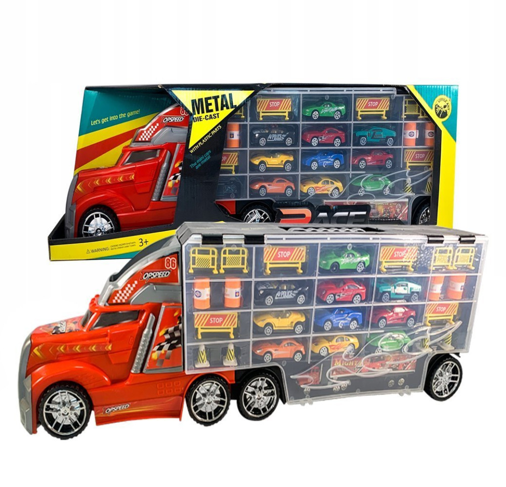 Zestaw składa się z ciężarówki, 10 resoraków wykonanych z metalu i dodatkowych akcesoriów oraz doczepianej lawety w kształcie walizki, którą wygodnie można transportować wraz z zawartością.