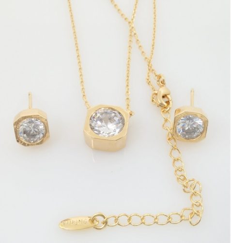 Wszystkie elementy pięknie współgrają ze sobą. W skład koletu wchodzi naszyjnik i kolczyki pięknie wysadzane cyrkoniami.Podkreśli elegancję każdej kobiety.