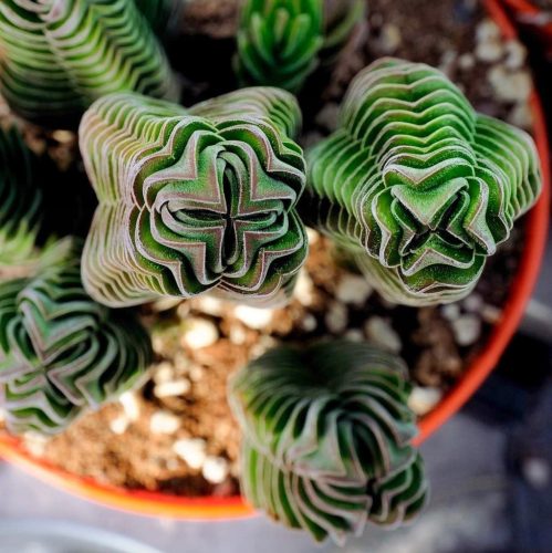 Crassula ‘Buddha’s Temple’ – ciekawy kultywar stworzony ze skrzyżowania gatunków Crassuli pyramidalis i Crassuli perfoliata var. minor. Grubosz ten to sukulent o gęsto ułożonych podwiniętych listkach których powierzchnia pokryta jest delikatnym meszkiem. Roślina tworzy miniaturowe kolumny dorastające zaledwie do 15 cm wysokości i 4 cm szerokości. Ma tendencje do krzewienia się tworząc u podstawy nowe odrosty. Wypełniona rozetkami doniczka wygląda niczym śliczny, miniaturowy las. Gdy Crassula ‘Buddha’s Temple’ zakwitnie, na szczycie rozetek pojawiają się w zwartych gronach drobniutkie, białoróżowe kwiaty.