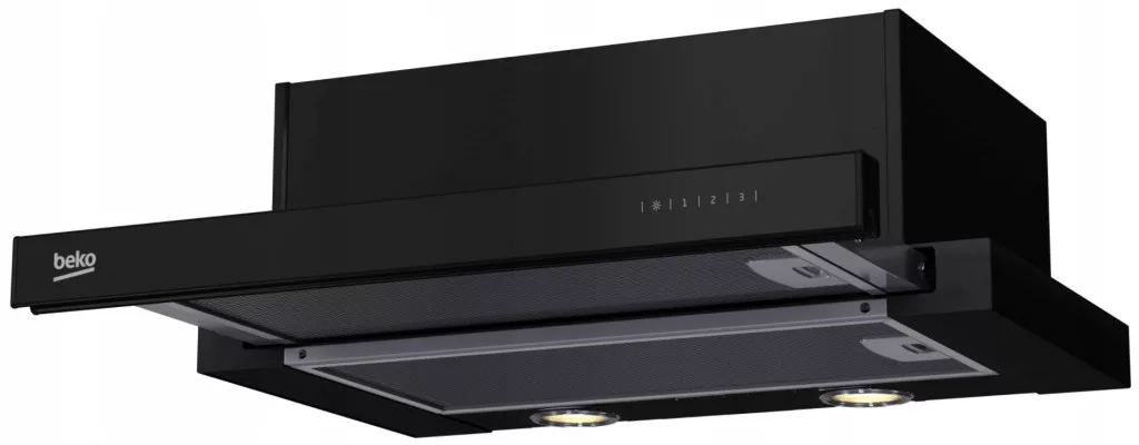 Okap teleskopowy o maksymalnej wydajności 366 m3/h, filtry dostosowane do mycia w zmywarce, sterowanie dotykowe.