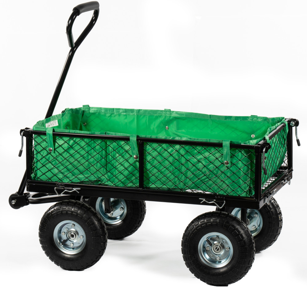 ✅Wózek ogrodowy wielozadaniowy - może służyć jako wózek, taczka, transporter a nawet przyczepka. Jest pomocny w pracach ogrodowych (transport ziemi, liści, gałęzi, jabłek), polowych (transport nawozów, produktów rolnych) lub do przewożenia drewna i węgla do kotłowni. Wózek posiada 4 pompowane koła, skrzynię wykonaną ze stali i uchwyt do ciągnięcia. Dodatkowo w wózku znajduje się plandeka, która umożliwia przewożenie materiałów sypkich takich jak: ziemia, piach czy liście. Nie wymaga użycia dużej siły fizycznej, dzięki czemu mogą z niego korzystać także dzieci. Wykonany z wytrzymałych materiałów, pozwala załadować ciężar do 350 kg.