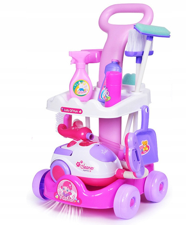 Profesjonalnie wyposażony zestaw sprzątający na wózku z odkurzaczem i kompletem akcesoriów do mycia oraz sprzątania pozwoli wczuć się każdej małej dziewczynce w rolę Perfekcyjnej Pani Domu. Dzieci, a zwłaszcza małe dziewczynki uwielbiają naśladować swoje mamy sprzątaniu, gotowaniu i pozostałych pracach domowych.