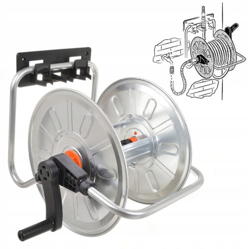 Bęben ścienny przenośny "ZINCATO" . Może on w wygodny sposób nawinąć do 50 metrów węża 1/2". Obrotowe podłączenie przyłącza zapobiega skręcaniu się węża przy rozwijaniu i zwijaniu.