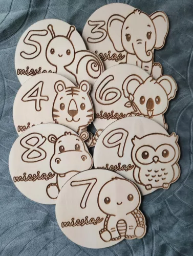 Piękne starannie wykonane drewniane karty do zdjęć dokumentujące pierwszy rok życia dziecka z orginalnymi wzorami upięknią każdy album.