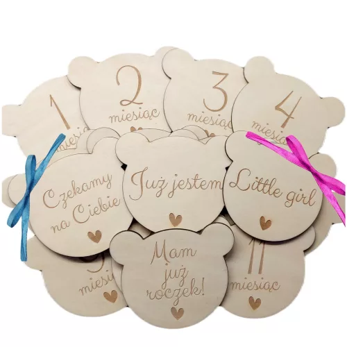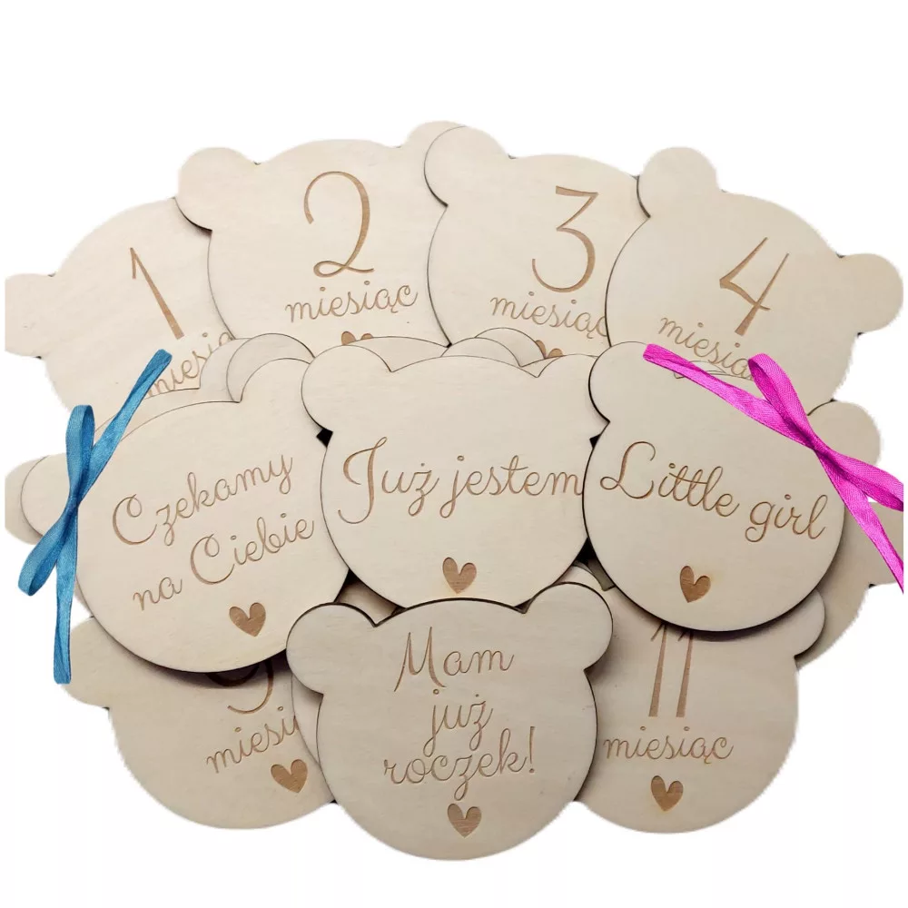 Drewniane tabliczki karty do zdjęć dokumentujące pierwsze miesiące życia Twojego dziecka. Tabliczki wykonane są metodą laserową. Ręcznie szlifowane.