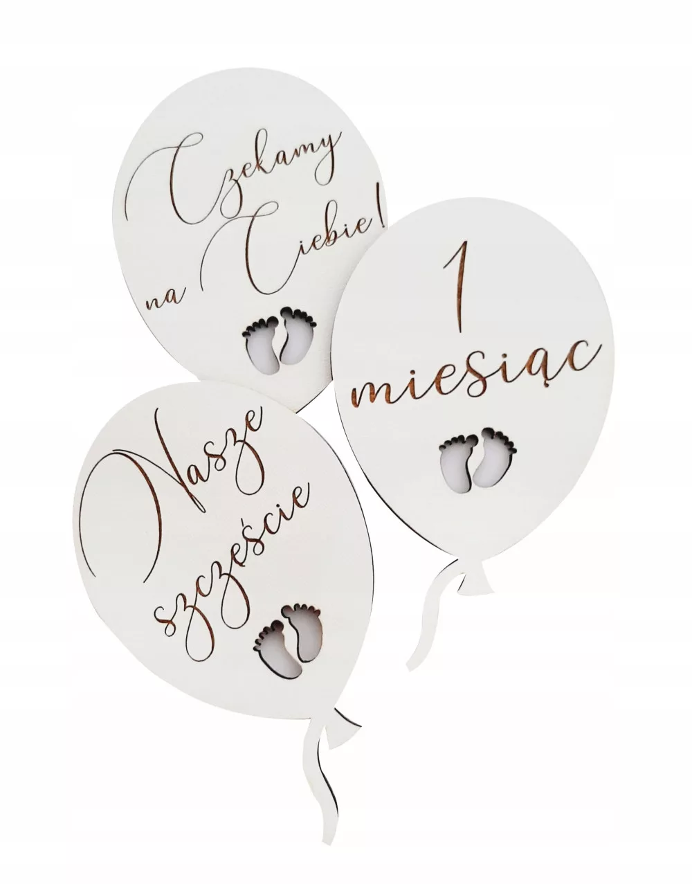 Grawerowane tabliczki w kształcie baloników z wyciętymi stópkami.