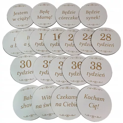 Otrzymujesz do dyspozycji 20 tabliczek z tygodniami ciąży i ciekawymi napisami co pozwoli Ci na wykonanie wielu zdjęć w trakcie ciąży.