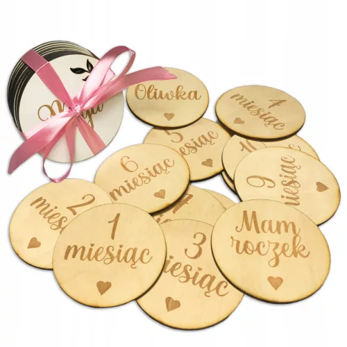 Zestaw drewnianych tabliczek idealnie sprawdzi się jako dodatek do sesji zdjęciowych Waszego maluszka. Z pomocą plakietek można każdego miesiąca zrobić dziecku pamiątkowe zdjęcie, dzięki temu po roku stworzycie cudowną kolekcję zdjęć. Będzie to wspaniała pamiątka, która pokaże Wam jak Wasz maluszek zmieniał się z miesiąca na miesiąc.