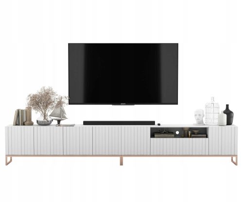 Dwie szafki RTV w stylu Glamour z kolekcji ELPIS, idealnie nadają się pod telewizor oraz dodadzą każdemu wnętrzu niepowtarzalnej elegancji. Umieszczone obok siebie tworzą jeden długi, bardzo ładnie prezentujący się mebel, który gwarantuje wiele miejsca do funkcjonalnego przechowywania. Dedykowana półka na urządzenia RTV oferuje pełen komfort użytkowania. Zastosowany w miejscu otwartej półki otwór na kable pozwoli na wygodne przeprowadzenie przewodów. System "push to open" do otwierania drzwiczek zapewnia estetyczny wygląd szafki, ze względu na brak widocznych uchwytów. Występuje również możliwość regulacji wysokości półek, która pozwala na dostosowanie przestrzeni do indywidualnych potrzeb. Meble z tej kolekcji wyróżniają się na tle innych szafek RTV ryflowanymi frontami, które podkreślają nowoczesny i elegancki wygląd szafek.
