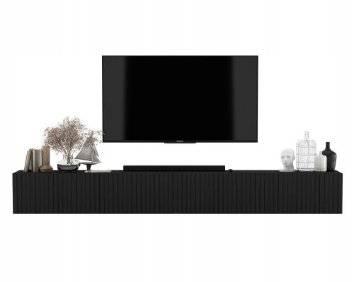 Dwie wiszące szafki RTV w stylu Glamour z kolekcji ELPIS, idealnie nadają się pod telewizor oraz dodadzą każdemu wnętrzu niepowtarzalnej elegancji. Umieszczone obok siebie tworzą jeden długi, bardzo ładnie prezentujący się mebel. Posiadają cztery funkcjonalne, zamykane komory z podziałem na dwa poziomy. System "push to open" do otwierania drzwiczek zapewnia estetyczny wygląd szafki, ze względu na brak widocznych uchwytów. Występuje również możliwość regulacji wysokości półek, która pozwala na dostosowanie przestrzeni do indywidualnych potrzeb. Meble z tej kolekcji wyróżniają się na tle innych szafek RTV ryflowanymi frontami, które podkreślają nowoczesny i elegancki wygląd szafek.