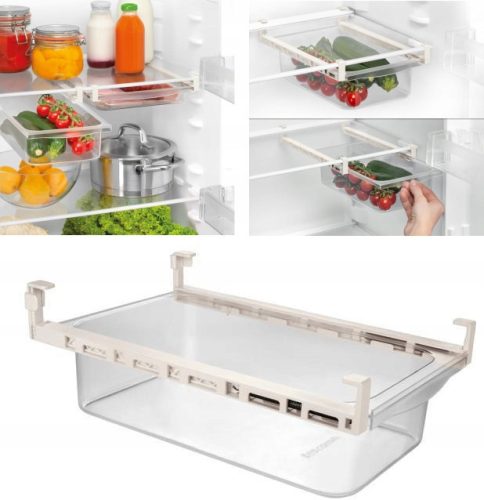 Doskonała do przejrzystego przechowywania i wygodnego wyjmowania żywności oraz optymalnego wykorzystania wolnego miejsca w lodówkach i szafkach kuchennych. Uniwersalna, odpowiednia do zamontowania przy pomocy łatwo regulowanych uchwytów na wszystkich typach wyjmowanych półek w lodówkach i szafkach. Szuflada została wykonana z wytrzymałego tworzywa sztucznego oraz stali nierdzewnej. Gwarancja 3- letnia.