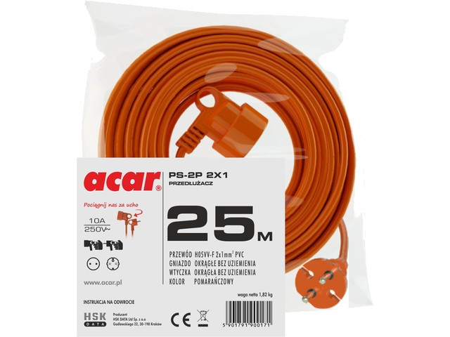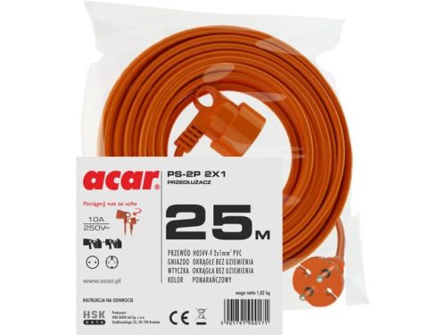Profesjonalny przedłużacz ogrodowy marki ACAR o długości 25 metrów to wysokiej jakości produkt. Produkt jest w kolorze pomarańczowym i nie posiada uziemienia. Producent zadbał tutaj o przewody H05VV-F, których przekrój zapewni znaczną poprawę pracy nawet najbardziej wymagających urządzeń ogrodowych. Izolacja zapewni wyjątkowe bezpieczeństwo oraz wytrzymałość na uszkodzenia.