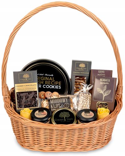 Kosz prezentowy należy złożyć samodzielnie - zawartość, ozdobny kosz oraz materiały potrzebne do jego złożenia takie jak folia celofanowa czy wypełnienie drzewne dodajemy do paczki.