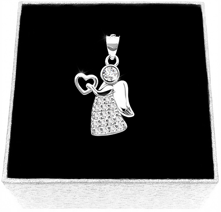 Zawieszka Aniołek z serduszkiem zdobiona cyrkoniami koloru białego o diamentowym szlifie.
