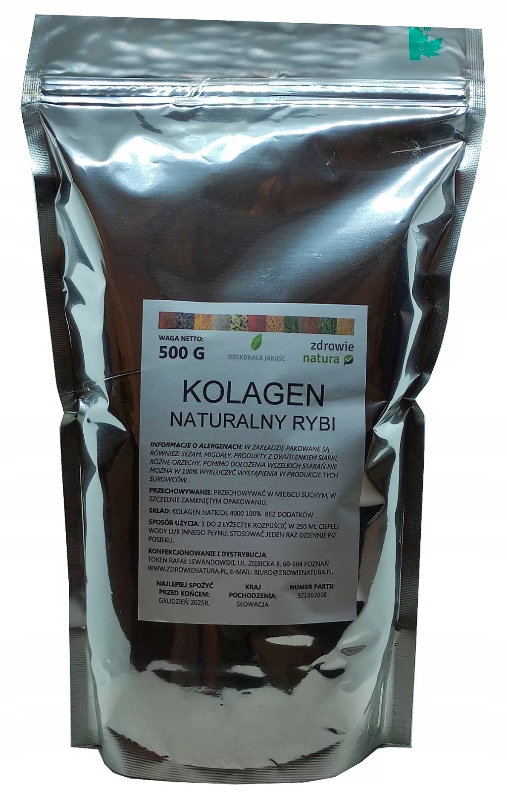 Kolagen jest pakowany w worki typu doypack. Opakowanie charakteryzuje się dużą barierowością, dzięki czemu produkt zachowa na długo swoje dobroczynne właściwości. Szczelne zamknięcie typu zipper umożliwia wielokrotne otwieranie i zamykanie torebki.
