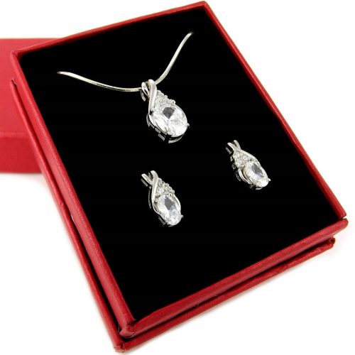 Komplet biżuterii wykonany z wysokiej jakości srebra próby 925, składający się z eleganckiego naszyjnika z subtelnym wisiorkiem oraz dopasowanych, ślicznych kolczyków.