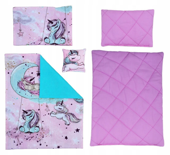 Pościel składa się z kompletu 2 poszewek (na podusię i na kołderkę) oraz różowych wkładów. Komplet urozmaica mała poduszeczka typu "jasiek".