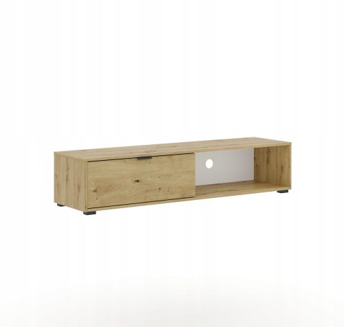 Szafka Comfy to prosty w swej konstrukcji mebel, co w tym przypadku jest zaletą. Mamy tutaj długi, gładki blat – idealny do rozstawienia dekoracji i dodatków, które nadadzą wnętrzu charakteru. Oprócz tego jest zamykana szafka z designerskim uchwytem oraz otwarta półka na sprzęt audio – wideo wraz z otworem na kable. Dzięki takiej budowie mebel jest maksymalnie funkcjonalny, pozbawiony zbędnych elementów i pozwala uporządkować przestrzeń pod telewizorem.