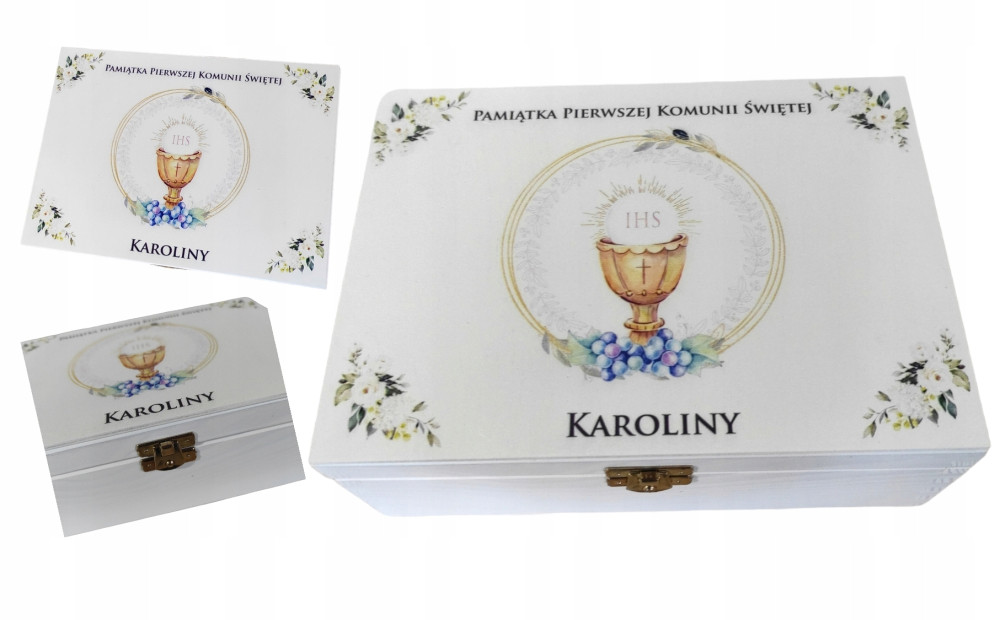 na zewnątrz posiada efektowną dedykacją na Komunię, wykonaną metodą trwałego nadruku uv, które będzie oryginalnym i wyjątkowym, personalizowanym prezentem