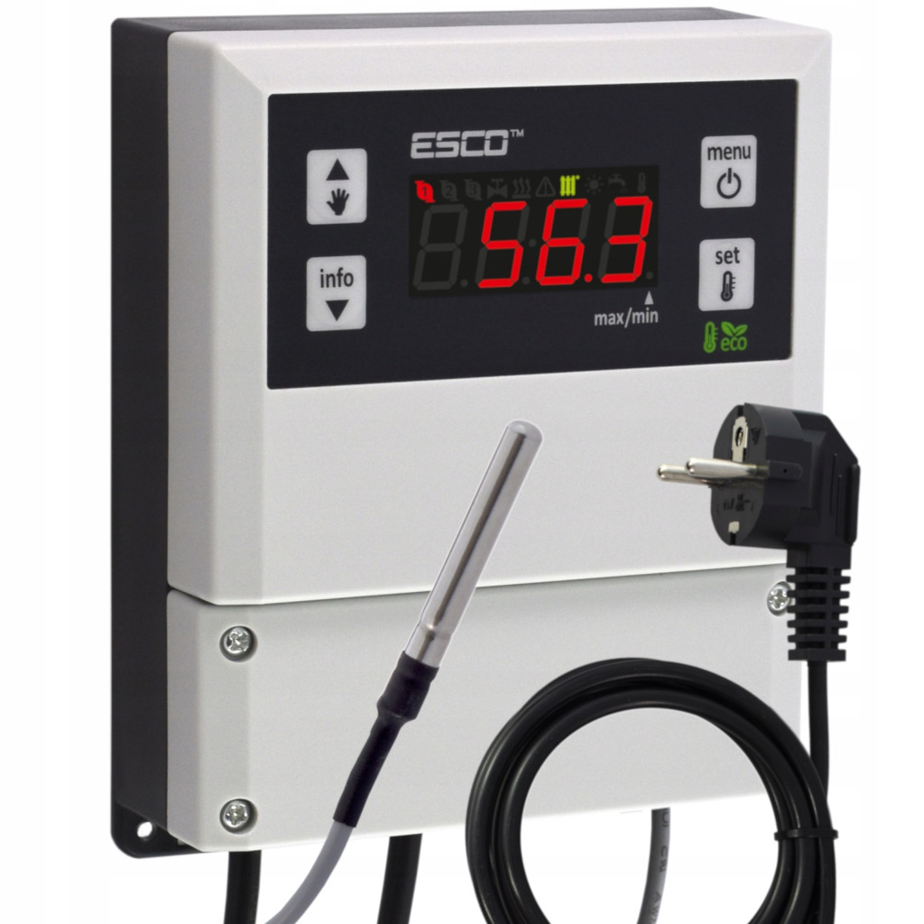 Regulator temperatury CO-10 z wyświetlaczem LED do automatycznego załączania pompy obiegowej centralnego ogrzewania. Gdy temperatura osiągnie ustawioną wartość, regulator uruchamia pompę obiegową i wyłączy ją dopiero gdy kocioł wychłodzi się do zadanej niej niskiej temperatury. Wykorzystanie regulatora CO-10 pozwala wyłączyć pompę obiegowa kiedy temperatura wody jest niewystarczająca do sprawnego podgrzewania pomieszczeń. Dzięki takiemu działaniu zapobiegamy niepotrzebnemu działaniu pompy, oszczędzamy energię elektryczną, wydłużamy również czas żywotności pompy. Regulator CO-10 posiada również funkcję ANTY-STOP która zapobiega zastaniu pompy obiegowej poza sezonem, pompa uruchamia się co 10 dni na 1 minutę.