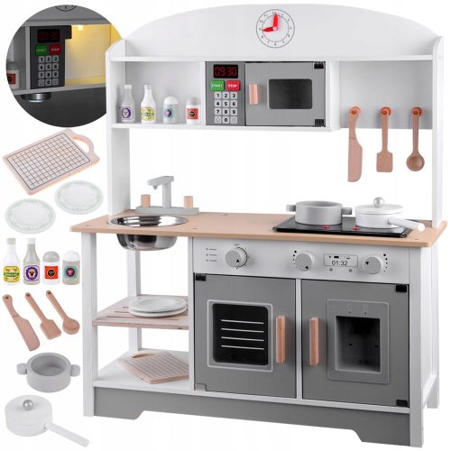 Kuchnia posiada szereg atrakcji; mikrofalówka z podświetleniem, podświetlana płyta indukcyjna z odgłosami gotowania, smażenia czy dystrybutor wody z funkcjami świetlnymi i dźwiękowymi, dzięki czemu zabawa staje się bardziej realistyczna. Drewniana kuchenka posiada również oświetlenie podszafkowe, które nie tylko ułatwia zabawę, ale także dodaje kuchni eleganckiego, nowoczesnego stylu.