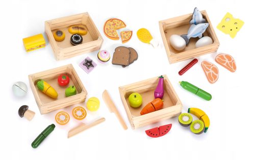 Duży drewniany zestaw do zabawy w sklep: 4 skrzyneczki pełne warzyw, owoców i innych smakowitych produktów.