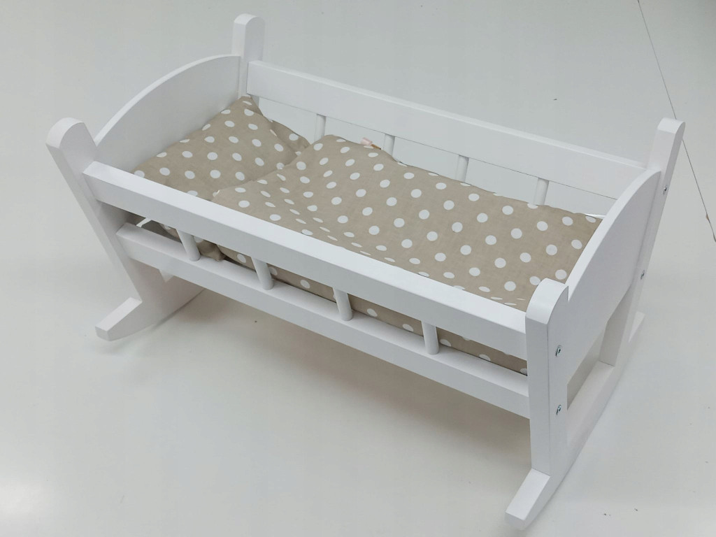 Urocza biała kołyska drewniana dla lalek, wykonana z drewna świerkowego.