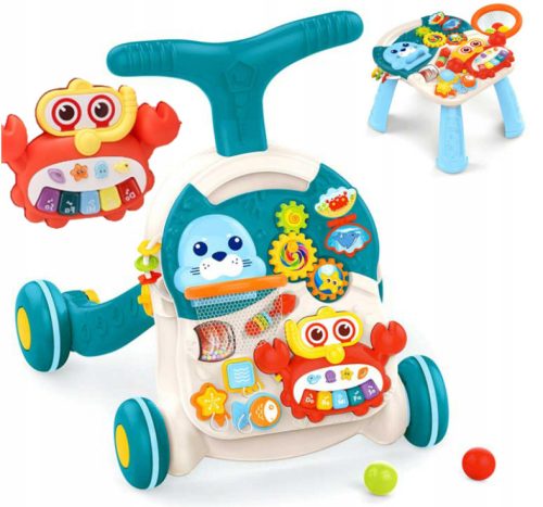 Idealny chodzik/pchacz 2w1 dla Twojego dziecka, z wieloma gadżetami na przednim panelu. W każdej chwili można go zamienić w edukacyjny stoliczek.