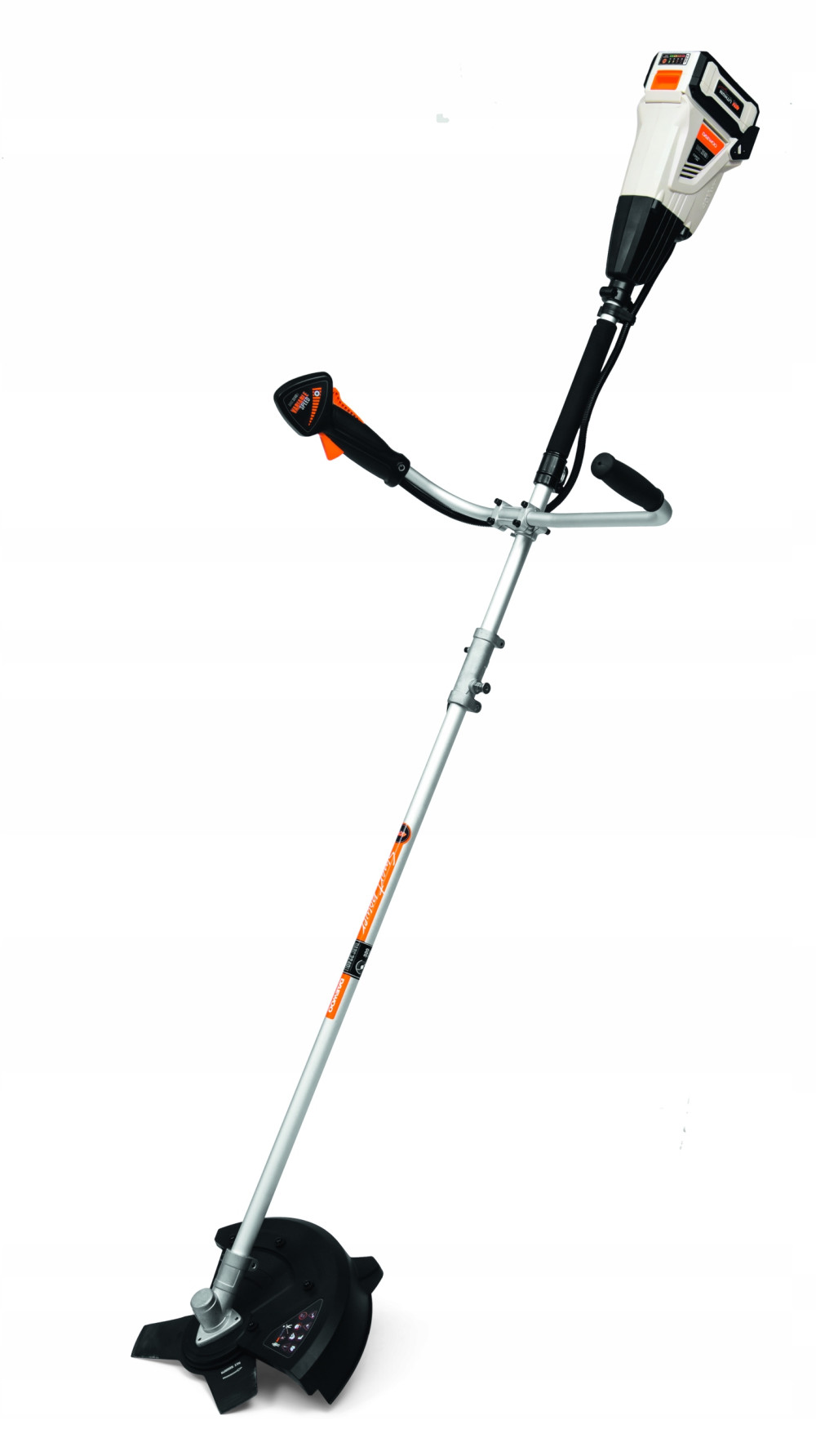Kosa akumulatorowa do koszenia trawy i zarośli. Dany model posiada składany trzonek aluminiowy ułatwiający przechowywanie. W skład zestawu wchodzi nóż trójzębny i głowica z półautomatycznym systemem wysuwania żyłki.