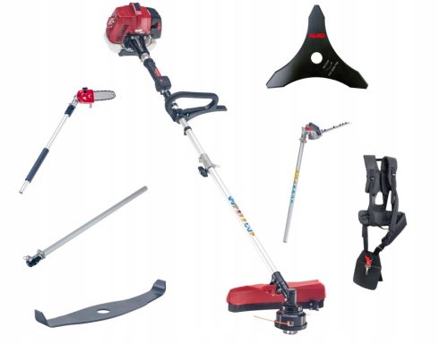 Profesjonalne, bardzo wydajne wielofunkcyjne urządzenie spalinowe 8w1 wyposażone w wydajny silnik dwusuwowy o mocy aż 0,9 kW. Maszyna posiada w zestawie głowicę żyłkową z systemem automatycznego wysuwania żyłki, trójzębną tarczę tnącą, profesjonalne szelki nośne, przystawkę w postaci nożyc do żywopłotu, okrzesywarkę do gałęzi, przedłużenie wału 100 cm oraz nóż mulczujący.