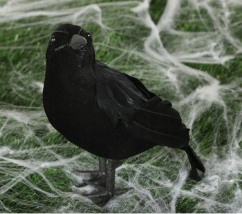 Dekoracja do postawienia lub przymocowania. Czarny ptak - kruk to idealne uzupełnienie przebrania dla czarownicy, wiedźmy czy maga. Zdecydowanie dobrze będzie uzupełniać dekorację cmentarną, gotycką lub dopełniać scenografię nawiedzonego domu. Pasuje także jako imitacja wrony czy gawrona. Ptaszek pokryty jest gładkimi, czarnymi, sztucznymi piórkami. Posiada czarny dziób i błyszczące oczy, co dodaje mu realistycznego wyglądu. Przy łapkach znajdują się druciki, aby łatwiej było go przymocować do wybranej powierzchni, np. gałęzi.