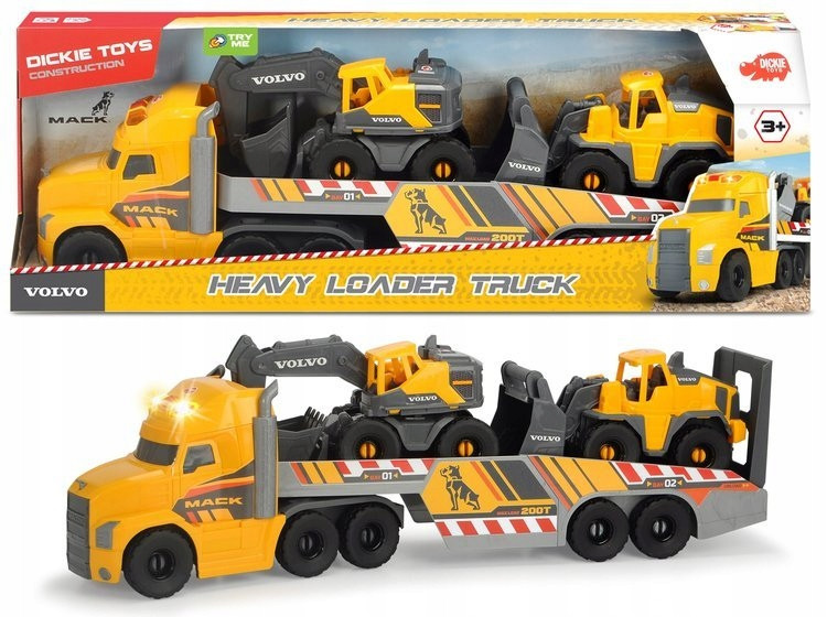 Zestaw składa się z trzech samochodów budowalnych: laweta Volvo Mack (długość ok.70 cm), koparka (długość ok.26 cm)i spychacz (długość ok. 26 cm).